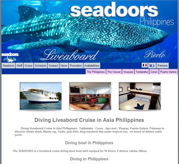 The SEADOORS is a liveabord cruise diving steel boat well equiped for 16 divers, 8 deluxe cabins, Nitrox. Diving liveaboard Cruise in Asia Philippines: Tubbataha , Coron , Apo reef , Visayas, Puerto Galera, Palawan to discover whale shark, Manta ray, Turtle, jack fishs, king mackerel fish,under tropical sun, on board of deluxe cabin yacht .