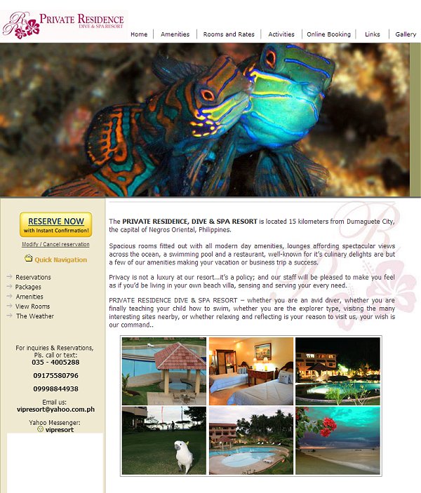The Private Residence, Dive & SPA Resort is located 15 kilometers from Dumaguete City, the capital of Negros Oriental, Philippines. Spacious rooms fitted out with all modern day amenities, lounges affording spectacular views across the ocean, a swimming pool and a restaurant, well-known for it’s culinary delights are but a few of our amenities making your vacation or business trip a success.
