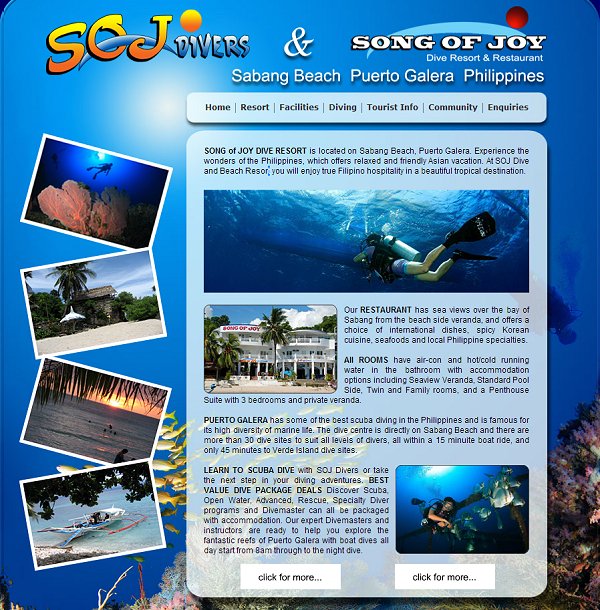 Song of Joy Dive Resort is located on Sabang Beach, Puerto Galera. Experience the wonders of the Philippines, which offers relaxed and friendly Asian vacation. At SOJ Dive and Beach Resort you will enjoy true Filipino hospitality in a beautiful tropical destination.