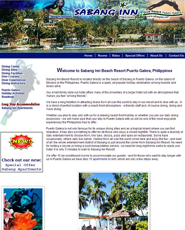 Sabang Inn Beach Resort is located directly on the beach of Sabang in Puerto Galera, on the island of Mindoro in the Philippines. Puerto Galera is a quiet, yet popular holiday destination among tourists and divers alike.
