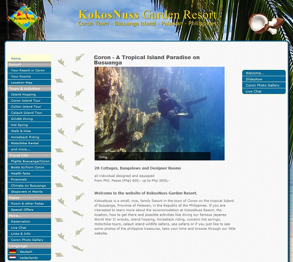 If you are interested to learn more about the accommodation at KokosNuss Resort, the location, how to get there and possible activities like diving our famous japanes World War II wrecks, island hopping, horseback riding, vulcanic hot springs, motorbike tours, calauit island wildlife safaris, sea safaris or if you just like to see some photos of the philippine treasures, take your time and browse through our little website.