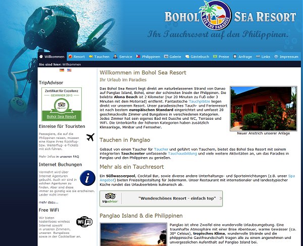"The Bohol Sea Resort lies directly at the beach of Danao on Panglao Island, Bohol, one of the most beautiful islands of the Philippines. This vacation paradise is furnished after the best European standards.